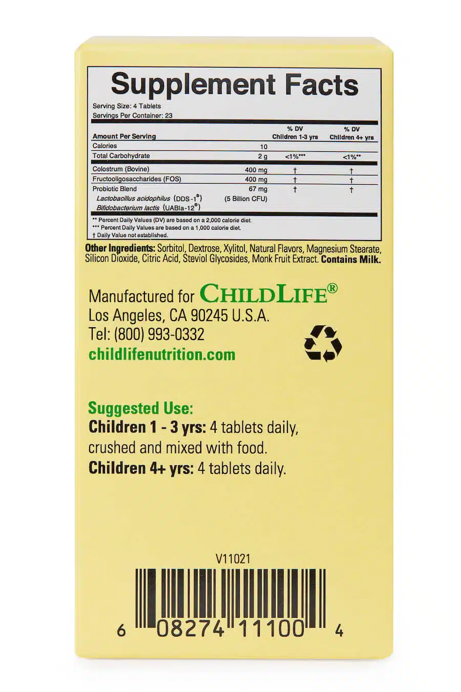 Ingredients: Colostrum (Bovine), Fructooligosaccharides (FOS), Probiotic Blend (Lactobacillus acidophilus (DDS-1(R)), Bifidobacterium lactis (UABla-12(R))), Sorbitol, Dextrose, Xylitol, Natural Flavors, Magnesium Stearate, Silicon Dioxide, Citric Acid, Steviol Glycosides, Monk Fruit Extract. Contains Milk.