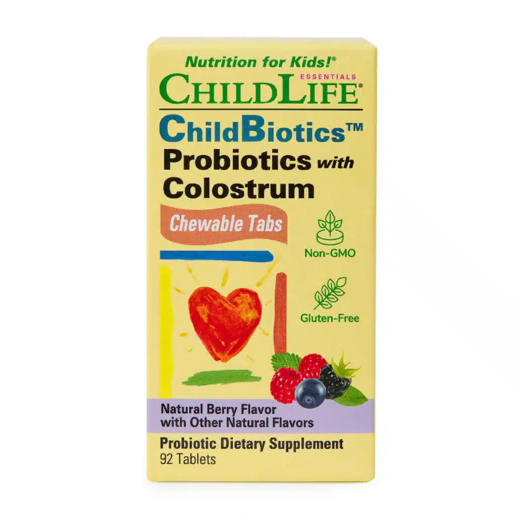 ChildLife Essentials® ChildBiotics Probiotics with Colostrum® (Chewable) may be given from age 1, continuing throughout the teenage years.
