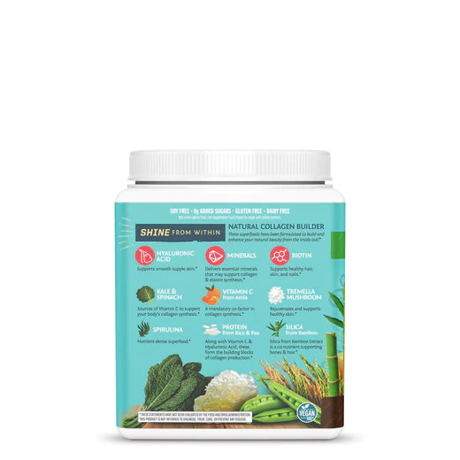 Pollutants in water, air, and food deplete our collagen storehouse making replenishment vital. A majority of collagen supplements come from the bones, skin, and connective tissue of animals, including cattle, fish, horses, pigs, or rabbits. Why ingest animal-derived collagen when your body is designed to generate its own? Sunwarrior offers the plant-based solution, tailored to boost your body’s inherent collagen production. It’s our inside-out approach!