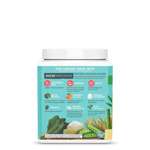 Pollutants in water, air, and food deplete our collagen storehouse making replenishment vital. A majority of collagen supplements come from the bones, skin, and connective tissue of animals, including cattle, fish, horses, pigs, or rabbits. Why ingest animal-derived collagen when your body is designed to generate its own? Sunwarrior offers the plant-based solution, tailored to boost your body’s inherent collagen production. It’s our inside-out approach!