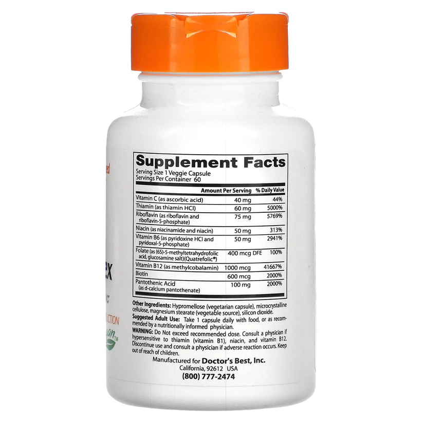 Doctor’s Best Fully Active B Complex contains all eight important B Vitamins, a full spectrum designed for optimal absorption and utilization to support overall health and well-being. Water-soluble B vitamins play important roles in cell metabolism, supporting DNA, organs, genes, cells, tissues, skin health, immune system, enzyme functions and energy production.