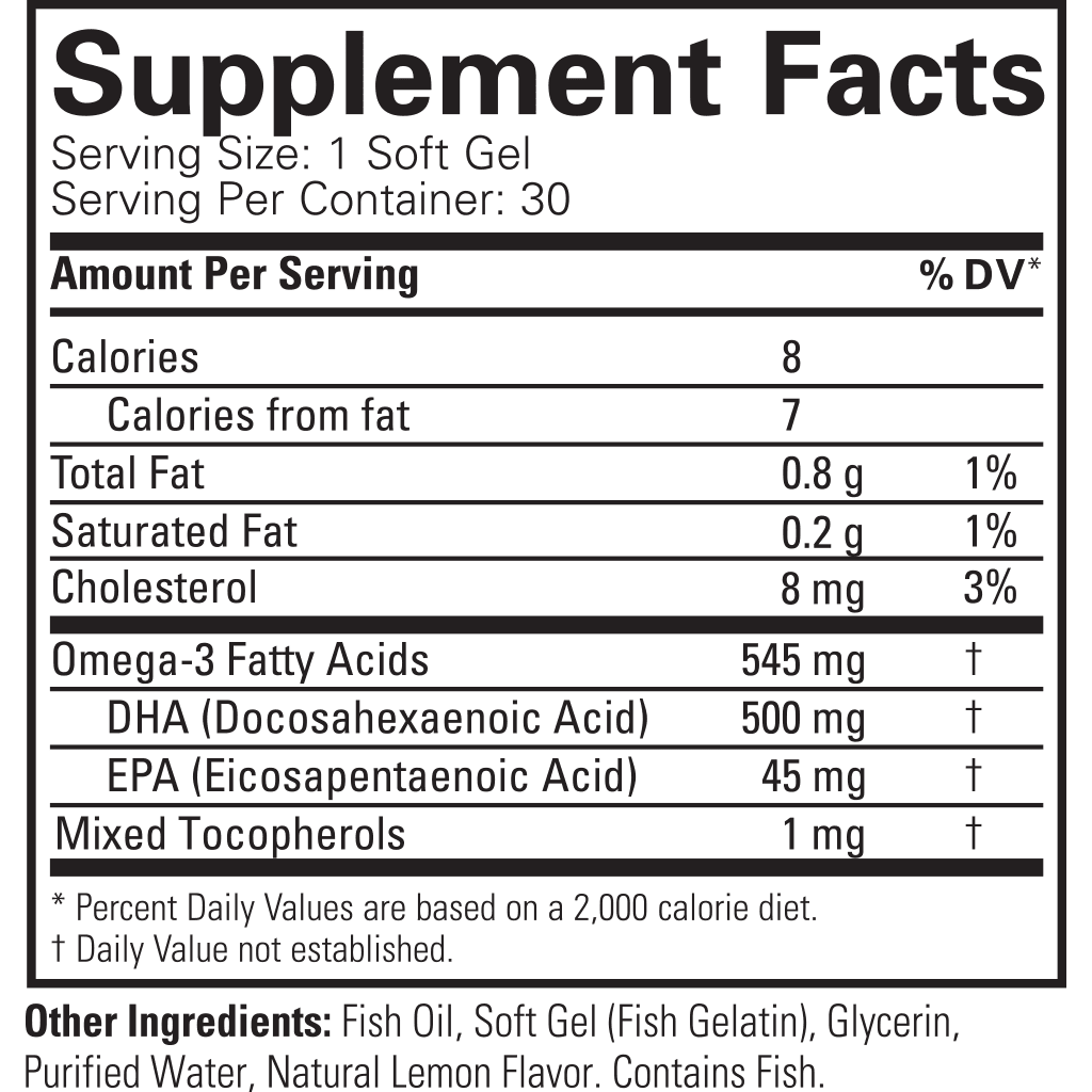 Ingredients: DHA (Docosahexaenoic Acid), EPA (Eicosapentaenoic Acid), Mixed Tocopherol, Fish Oil, Soft Gel (Fish Gelatin), Glycerin, Purified Water, Natural Lemon Flavor. Contains Fish.